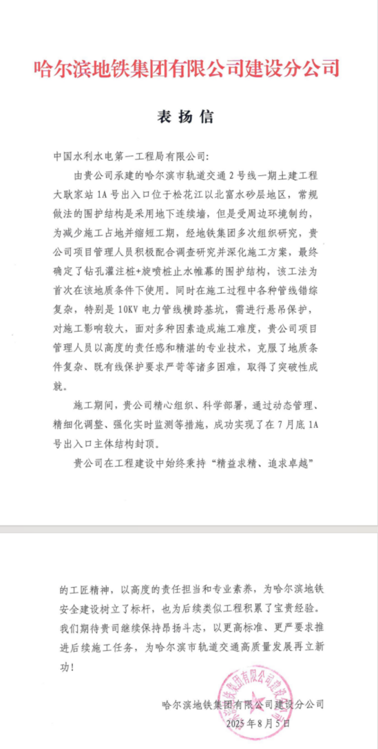 近日,公司承建的哈爾濱市軌道交通2號線一期土建工程大耿家站1A出入口項目順利封頂,得到哈爾濱地鐵集團有限公司建設分公司發來的表揚信,充分肯定了公司在工程建設中展現出的責任擔當與專業素養。 信中指出:項目施工期間,水電一局精心組織、科學部署,通過動態管理、精細化調整、強化實時監測等措施,成功實現了在7月底1A出入口主體結構封頂,為哈爾濱地鐵安全建設樹立了標桿。 大耿家站1A出入口過輔路段長18.40米,寬9.60米,沿松北大道方向長53.70米,寬8.30米,敞口段寬8.10米。前期施工場地受限,無法滿足施工條件,臨時征地極為困難,項目部多次協商奇石城商戶最終解決臨時占地問題,該出入口位于松花江以北富水砂層地區,經項目管理人員配合地鐵集團調差查研究和深化施工方案,采用“鉆孔灌注樁+旋噴樁止水帷幕的圍護結構”,該工法為首次在該地質條件下使用,施工過程中各種管線錯綜復雜,埋深2-8米的PE400污水管線,埋深2.5米的國防光纜,特別是10千伏電力管線橫跨基坑,需進行懸吊保護施工,建設團隊克服了地質條件復雜、既有線保護要求嚴苛、征地、哈爾濱暴雨等諸多困難,確保了施工的安全與穩定。 項目將繼續秉持“精益求精、追求卓越”的工匠精神,加強組織領導,壓實主體責任,嚴格把控項目安全、質量和進度管理,進一步牢固樹立品牌意識,助力哈爾濱市軌道交通高質量發展! |